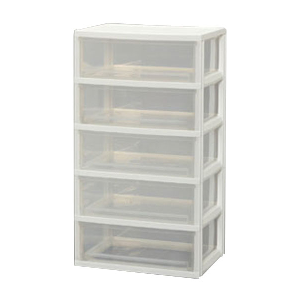 クローゼットや押入れの下段スペースを有効活用!ワイドチェストシリーズの5段タイプです。衣類の整理や、室内・サニタリー等での身の回りの整理・整頓など多目的にご利用頂けます。☆引出しとフレームの間にコロが付いているので、収納物の重量が増えても引出しをスムーズに開閉可能!☆本体の底面に付いたローラーが前後への移動もスムーズにします。☆クリアタイプの引出しで、中身の確認がしやすくなっています。●商品サイズ(cm)本体:幅約53.2×奥行き約38×高さ約97.3(ローラー取付時)引出し:幅約46×奥行き約33×高さ約15●主要材質:ポリプロピレン