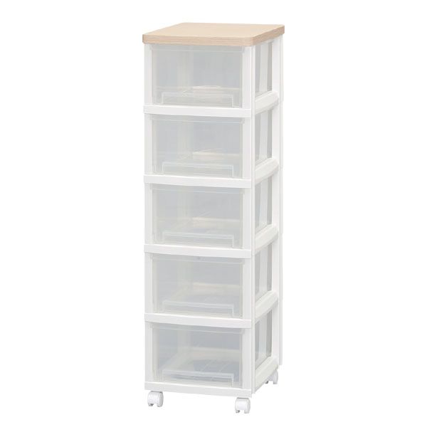 天板が木目調になっていて、キッチンやお部屋、お風呂周辺などにもぴったりのウッドトップチェストです。ケースは半透明なので中に入れた物が見え、押入れやクローゼット収納にもとても便利です。●商品サイズ(cm):幅約30.7×奥行き約39.2×高さ約101.8●引出し内寸(cm):幅約23×奥行き約31×高さ約15●商品重量:約4.4kg●主要材質天板:プリント紙化粧パーティクルボード引出し・フレーム:ポリプロピレン▼3段タイプはこちら!▼4段タイプはこちら!
