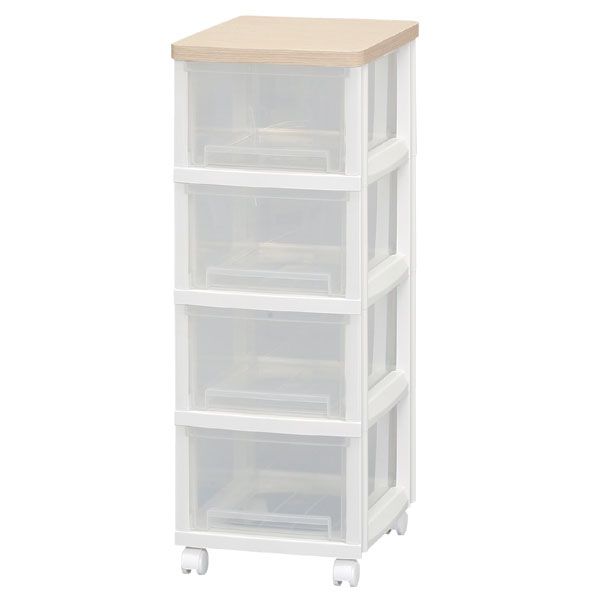 天板が木目調になっていて、キッチンやお部屋、お風呂周辺などにもぴったりのウッドトップチェストです。ケースは半透明なので中に入れた物が見え、押入れやクローゼット収納にもとても便利です。●商品サイズ(cm):幅約30.7×奥行き約37.8×高さ約83●引出し内寸(cm):幅約23×奥行き約31×高さ約15●商品重量:約3.78kg●主要材質天板:プリント紙化粧パーティクルボード引出し・フレーム:ポリプロピレン▼3段タイプはこちら!▼5段タイプはこちら!