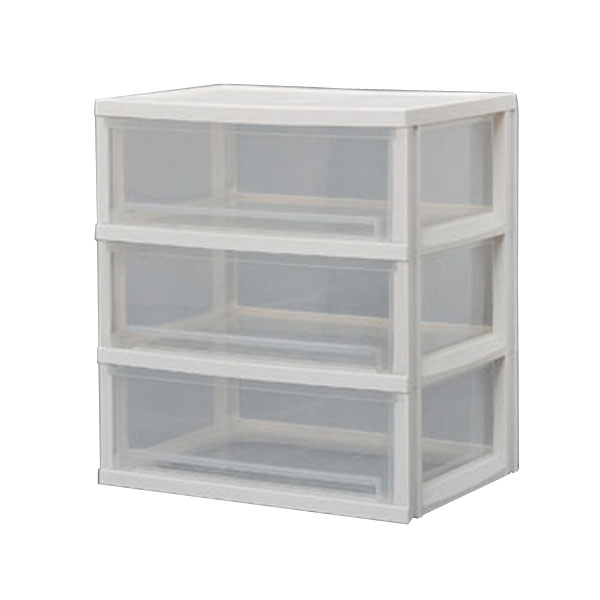 クローゼットや押入れの下段スペースを有効活用!ワイドチェストシリーズの3段タイプです。衣類の整理や、室内・サニタリー等での身の回りの整理・整頓など多目的にご利用頂けます。☆引出しとフレームの間にコロが付いているので、収納物の重量が増えても引出しをスムーズに開閉可能!☆本体の底面に付いたローラーが前後への移動もスムーズにします。☆クリアタイプの引出しで、中身の確認がしやすくなっています。●商品サイズ(cm)本体:幅約53.2×奥行き約38×高さ約59.7(ローラー取付時)引出し:幅約46×奥行き約33×高さ約15●主要材質:ポリプロピレン