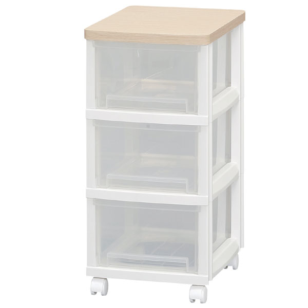 キッチンやお部屋、お風呂周辺などにぴったりウッドトップチェストです☆キャスター付で移動に便利なうえ、ケースは半透明なので中に入れたものが一目で分かります!天板はナチュラルテイストな木目調になっており、物を置いたり飾ったりできます。●商品サイズ(cm):幅約30.7×奥行き約37.8×高さ約64.2(キャスター込)●引出内寸(約):幅23×奥行き31×高さ15cm●収納の目安:Yシャツなら8枚、タオルなら8枚●主要材質天板:プリント紙化粧パーティクルボード本体・引出し・フレーム:ポリプロピレン▼4段タイプはこちら!▼5段タイプはこちら!